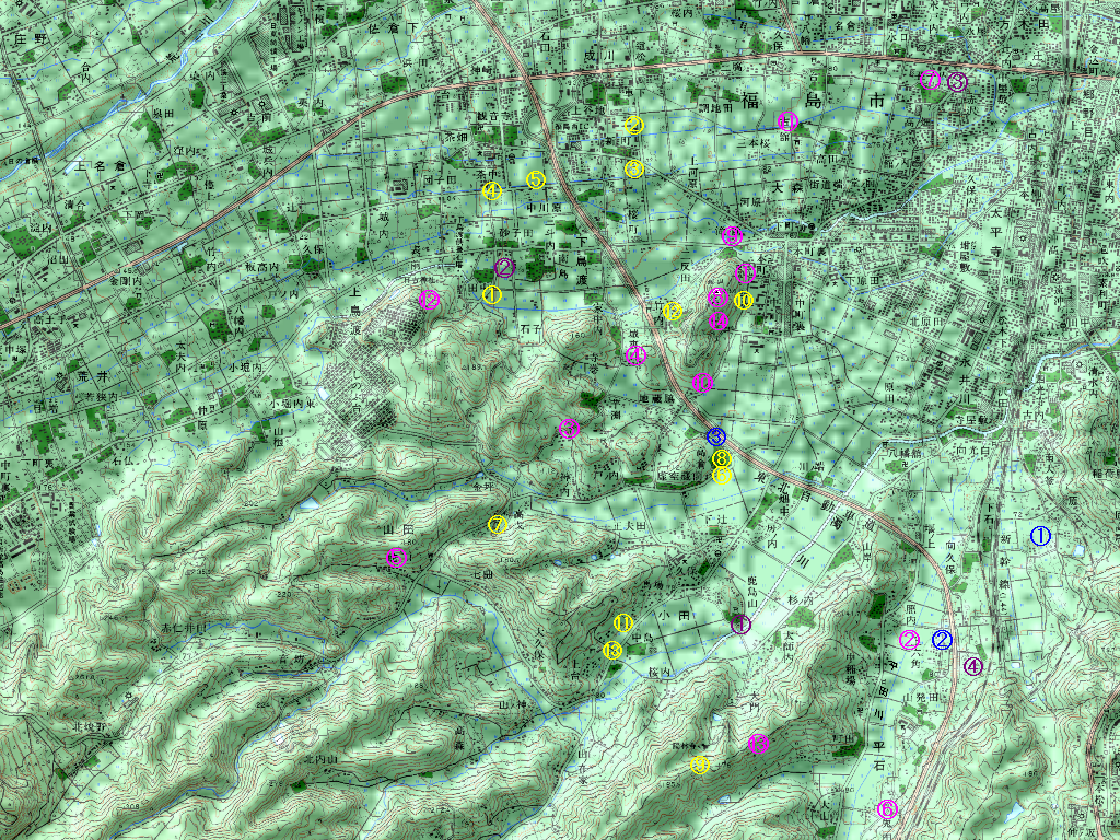 地図は『カシミール3D』より作成しました。 地図上の地名にマークしたもので、由来地を正しく示すものではありません。 地図の丸数字(@〜)をクリックすると説明を表示します。 桃色:地名、紫色:歴史伝説(地名を除く)、青色:自然伝説、黄色:信仰伝承 ●信夫支所中心の地図(国土地理院 地図閲覧サービス)が別ウィンドウで開きます。 |
