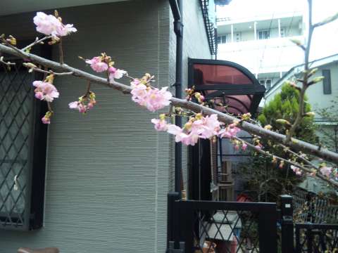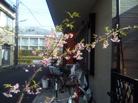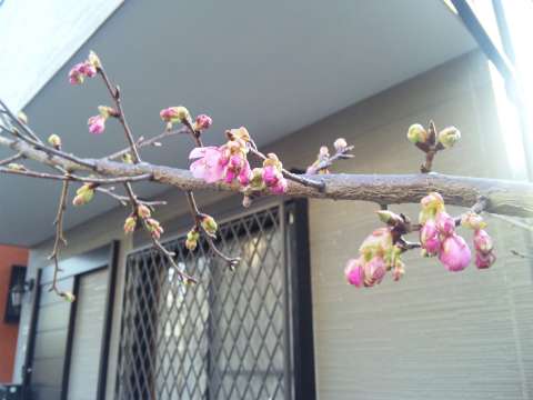我家の河津桜がほころびはじめました。