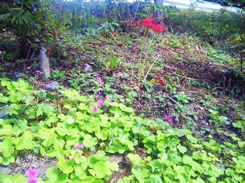 ピンクの花はムラサキカタバミだろうか。葉の形は似ているが、花が違うようにも思える。